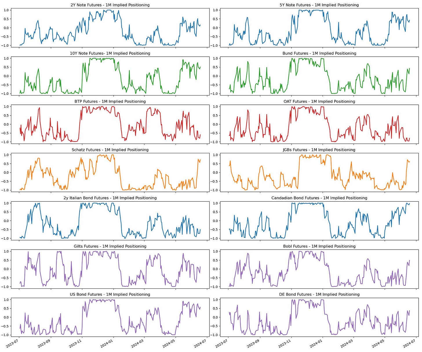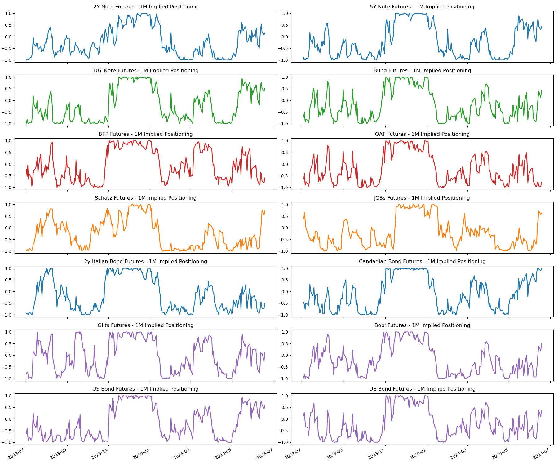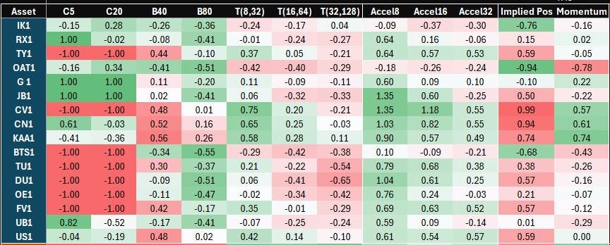 Looking globally, Gilts, JGBs, and Canadian government bonds are flashing green lights for longs according to signals. On the other hand, the front-end in EA is still a biased short. I would argue that this is more linked to risk premia and US monetary policy.